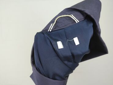 Damska marynarka granatowa - Klasyczny fason z kołnierzem i dwoma guzikami z przodu - Długość rękawów 3/4 z ozdobną lamówką wewnątrz mankietów (kontrastowe paseczki) - Dwie wszyte kieszenie z patk...Stan: