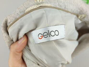 Przedstawiamy damską marynarkę marki Gelco, idealną na wiele okazji. Ta elegancka marynarka w odcieniu złamanej bieli, z delikatnym wzorem w jodełkę, łączy klasyczny styl z nowoczesnymi akcentami. Wyposażona jest w kołnierz z klapami, zapięcie na dwa guziki oraz dwie praktyczne kieszenie z klapami na przodzie, ozdobione beżowymi wstawkami i małymi brązowymi guzikami. Długie rękawy zakończone są mankietami z czterema ozdobnymi guzikami. Materiał z przewagą lnu zapewnia komfort noszenia i lekkość, co sprawia, że marynarka jest odpowiednia zarówno na cieplejsze dni, jak i jako element warstwowej stylizacji. Klasyczny krój i neutralna kolorystyka umożliwiają łatwe łączenie z różnorodnymi elementami garderoby, od formalnych spodni, przez spódnice, aż po jeansy.