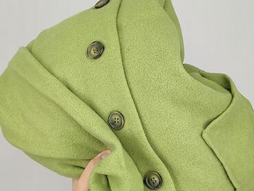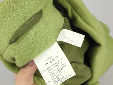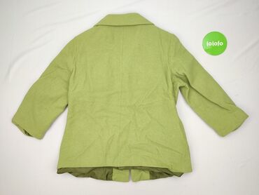 Marynarka damska w kolorze butelkowej zieleni. - Krój: lekko taliowany, bez zapięcia (otwarta klapa), rozcięcie z tyłu. - Rękawy: długość 3/4 z dekoracyjnym marszczeniem. - Materiał: tkanina o gęs...