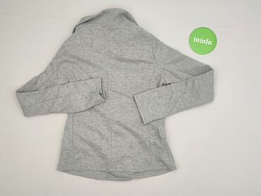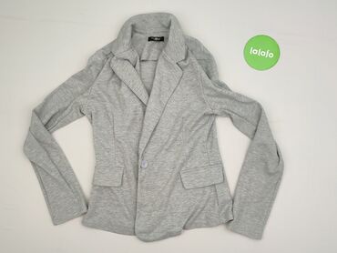 Damska marynarka w kolorze jasnoszarym - Fason: wydłużony żakiet z klasycznymi klapami - Zapięcie: trzy oblekane materiałem guziki z przodu - Rękawy: 3/4 - Kieszenie: dwie z patkami z przodu + bru...Stan: