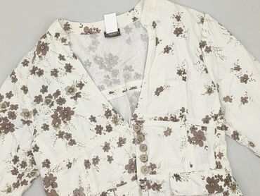 Żakiet damski z krótkim rękawem w kwiaty - Krój: klasyczny żakiet z kołnierzem i klapami, zapinany na trzy guziki z przodu (guziki w kształcie różyczek w kolorze różowym). - Rękaw: krótki. - Wzór:...