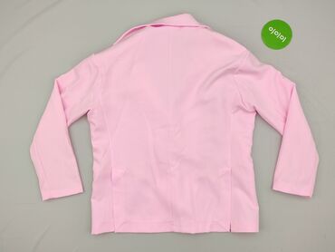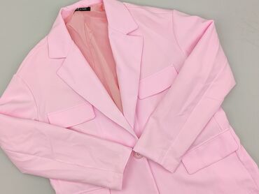 Różowy damski żakiet „Made in Italy” - Krój: lekko przedłużany, bez zapięcia, z szerokimi klapami - Rękawy: 3/4 z dekoracyjnymi marszczeniami/warstwami - Kieszenie: dwie naszywane z przodu (z patk...Stan:
