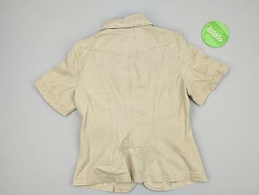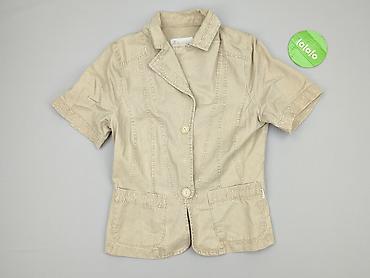Beżowa marynarka damska, rozmiar L - Krój: klasyczny żakiet z kołnierzem z klapami - Zapięcie: jeden guzik z przodu (biały) - Rękawy: 3/4 z szerokim mankietem - Kieszenie: dwie duże naszywane kies...