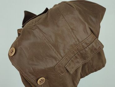 Używany, brązowy żakiet damski w dobrym stanie. Posiada trzy ozdobne guziki i rękawy o długości 3/4. Idealny do noszenia na co dzień lub na bardziej formalne okazje.