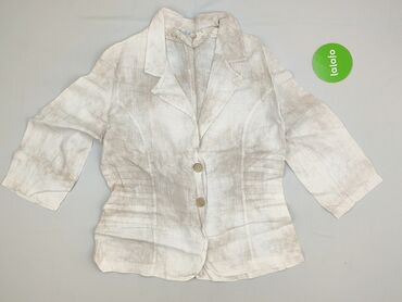 Żakiet damski SULTEX - Kolor: beż/len naturalny - Rozmiar z metki: 40 - Krój: lekko taliowany - Zapięcie: 3 drewniane guziki z przodu - Kołnierz: szeroki, z dekoracyjną listwą/lamówką - Rękaw: 3/4...