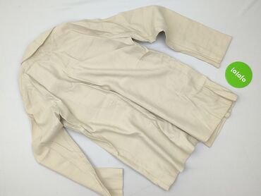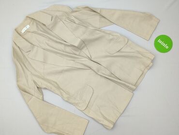Żakiet damski w kolorze beżowym, wykonany z mieszanki poliestru i wiskozy, co zapewnia komfort noszenia. Posiada długie rękawy i zapięcie na dwa guziki. Charakteryzuje się brakiem kołnierza, co nad...Stan: