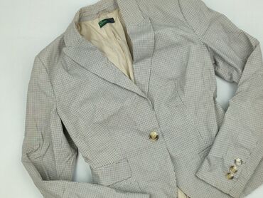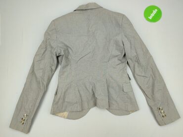 Jasnoszary żakiet damski z rękawami 3/4. Zapinany na trzy guziki, z klapami i dwoma małymi kieszeniami z przodu. Mankiety rękawów zdobią paski, dodając subtelnego akcentu. Wykonany z mieszanki bawe...