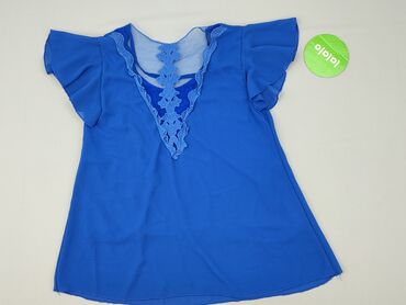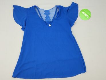 Bluzka damska w kolorze jasnego błękitu z romantycznymi koronkami. - Fason: taliowana z zaznaczoną gumką w pasie, tworzącą lekką falbanę u dołu - Dekolt: głęboki w kształcie litery V z wiązaniem n...Stan: