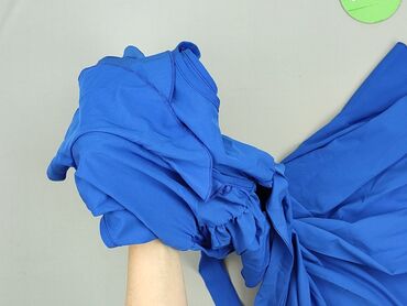 Sukienka damska w odcieniach granatu, niebieskiego i bieli z wzorem tie-dye. - Fason: rozkloszowany dół do kolan, gumka w pasie podkreślająca talię. - Dekolt: okrągły. - Rękawy: krótkie, bufiast...