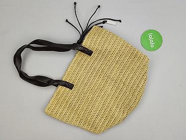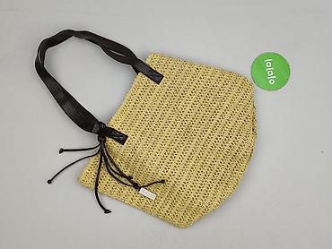 Torebka damska typu shopper/koszyk z plecionki - Materiał: plecionka syntetyczna w kolorze słomkowym; miękka podszewka w kolorze beżowym - Uchwyt: podwójne, czarne sznurkowe rączki z dekoracyjnymi...