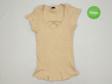 Bluzka damska House Brand Eco Aware, rozmiar M. - Krótki rękaw, okrągły dekolt - Kolor: jasny beż/ecru - Dzianina prążkowana, elastyczna i miękka - Model z marszczeniami po bokach z regulowanymi t...