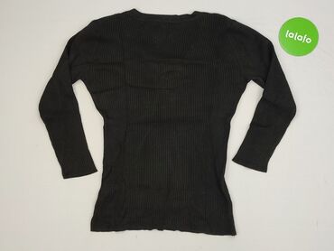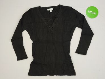 Czarna bluzka damska z długim rękawem, ozdobiona białymi, poziomymi paskami. Bluzka charakteryzuje się głębokim dekoltem w kształcie litery V. Dół bluzki oraz mankiety rękawów są wykończone gładkim...Stan: