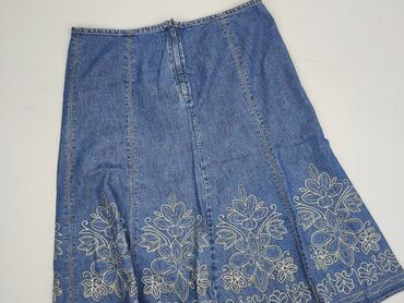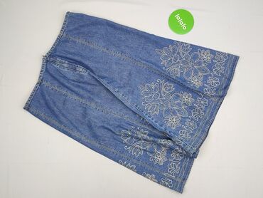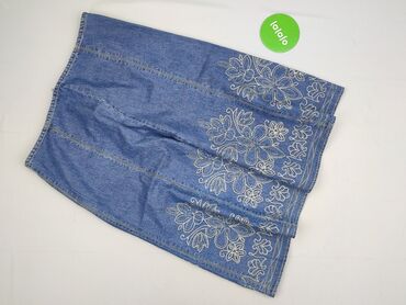 Jeansowa spódnica damska z aplikacją kwiatową - Materiał: 90% bawełna, 10% spandex – elastyczna, wygodna, dopasowująca się do sylwetki - Rozmiar z metki: XL - Krój: ołówkowy/mini do kolan, lekko a...