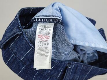 - Wzór: pionowe, cienkie paski (pinstripe) na granatowym jeansie