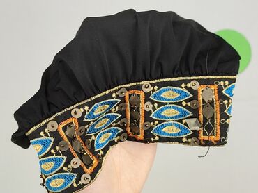 - Pas: szeroki, elastyczny, bogato haftowany w etniczny wzór (niebiesko‑pomarańczowo‑złoty) z naszytymi metalowymi aplikacjami/cekinami