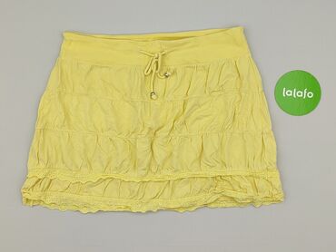 Żółto-biała spódnica w paski – damska - Krój: rozkloszowana, kilkupoziomowa (falbany), lekko asymetryczny dół - Wzór: pionowe i poziome paski w odcieniach pastelowej żółci i bieli - Talia: elastyc...Stan: