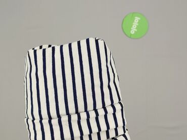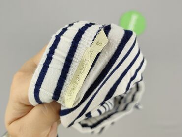 - Wzór: biało-granatowe, wąskie poziome paski (marynistyczny styl)