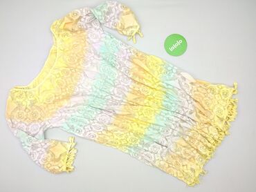Sukienka damska mini w multikolorowy, patchworkowy wzór - Krój: rozkloszowana mini z falbaną u dołu; odcięcie w pasie na elastycznej gumce podkreślającej talię - Rękawy: 3/4 zakończone szeroką, ma...