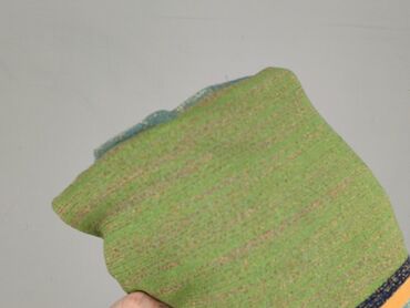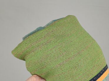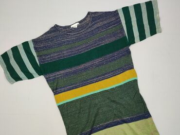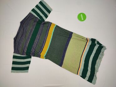 - Wzór: poziome pasy w odcieniach zieleni, granatu, żółci i turkusu; rękawy w szerokie pasy