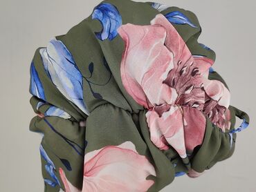 - Wzór: duże, malarskie kwiaty w odcieniach różu i niebieskiego na oliwkowym tle