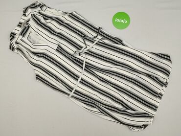 Sukienka damska marki H&M o klasycznym kroju w biało-granatowe pionowe paski. Model z dekoltem w kształcie litery V i krótkimi rękawami, idealny na cieplejsze dni. Sukienka posiada materiałowy pase...