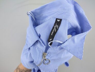 Sukienka damska mini zapinana na guziki z krótkim rękawem, wykonana z jasnoniebieskiego materiału. Krój koszulowy z kołnierzykiem i dwoma kieszeniami z przodu na piersiach. Dół sukienki ozdobiony f...