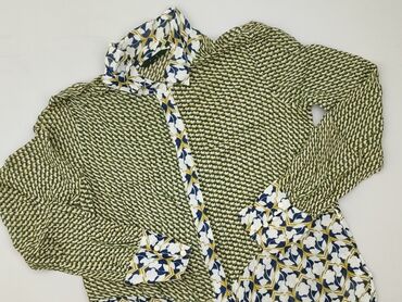 - Asymetryczne łączenie wzorów: góra i rękawy w drobny zielono-biało-żółty motyw fal/łusek; kołnierz, listwa guzikowa, mankiety i dolna część sukienki w kontrastowy geometryczno-kwiatowy print w kolorach biały/granat/ochra
