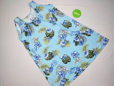 Sukienka damska z krótkim rękawem, rozmiar 46. - Wzór: tropikalne liście w odcieniach zieleni, beżu i bieli na kobaltowym tle. - Krój: dopasowana góra, lekko rozszerzany dół; odcięcie/zaszewki w ...