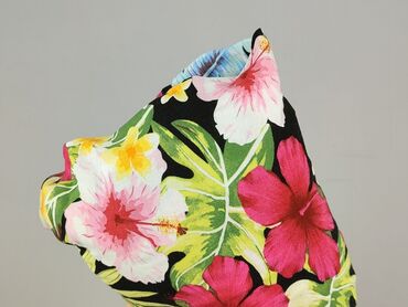 - Print: intensywne kwiaty hibiskusa i liście w kolorach różu, żółci, zieleni i błękitu na czarnym tle.