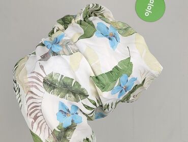 - Wzór: tropikalny print – zielone liście i niebieskie kwiaty na jasnym tle