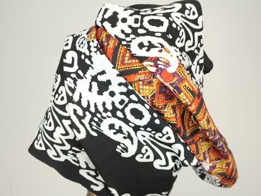 - Wzór: po bokach czarno‑białe, ornamentalne motywy; przez środek biegnie szeroki pas w etniczny, geometryczny print w odcieniach pomarańczu, czerwieni, żółci i fioletu.