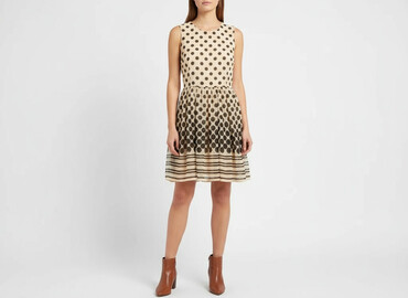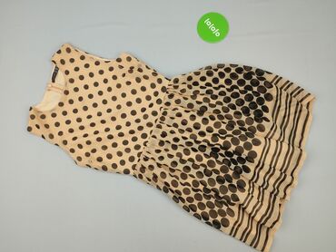 Elegancka sukienka damska w czarnym kolorze z białymi groszkami, charakteryzująca się fasonem z baskinką. Sukienka ma okrągły dekolt i jest bez rękawów. Materiał wykonany z mieszanki poliestru i el...