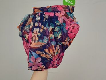 - Zwiewna, półprzezroczysta tkanina z nadrukiem w intensywne kwiaty: odcienie różu, turkusu, pomarańczu i zieleni na ciemnym tle.