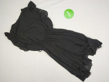 Czarna sukienka z falbanami - Krój: taliowana gumką w pasie, dół zakończony szeroką falbaną; krótkie rękawy z falbanką. Okrągły dekolt. - Długość: mini/przed kolano (na zdjęciach proporcje wskazuj...Stan: