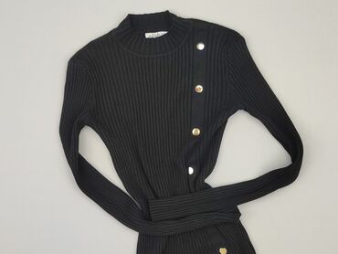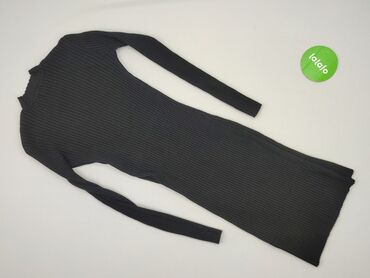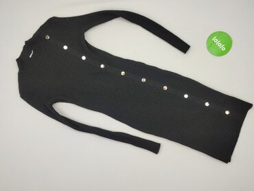 Czarna dzianinowa sukienka midi z długim rękawem - Fason: dopasowany, długość za kolano/midi - Dekolt: głęboki V z małą metalową wstawką w szpicu - Rękawy: długie - Tkanina: elastyczna, prążkowana...