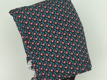 - Wzór: geometryczny, drobne romby/kwadraty w kolorach turkusu i czerwieni na czarnym tle