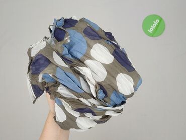- Wzór: duże grochy w kolorach bieli, błękitu i granatu na oliwkowo‑szarym tle