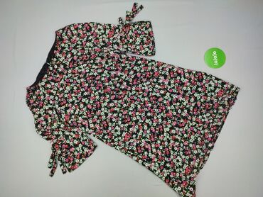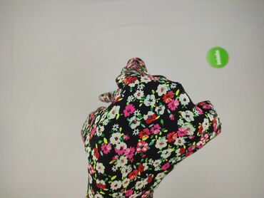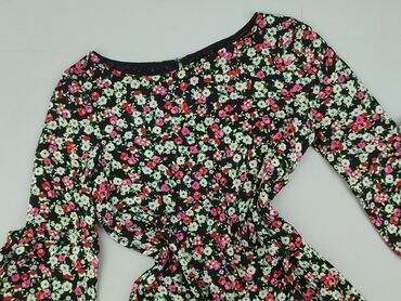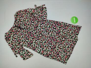 Sukienka w kwiaty, rozmiar S. - Krój: mini z falbaną u dołu, długie rękawy. - Dekolt: kopertowy w kształcie litery V. - Talia: podkreślona szeroką, elastyczną gumką (smock), ładnie dopasowuje się ...