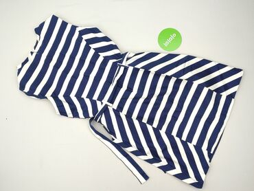 Sukienka w paski, granatowo-biała. - Krój: prosta, dopasowana do sylwetki, długość midi/przed kolano - Dekolt: kwadratowy - Rękaw: krótki, lekko poszerzany - Wzór: nieregularne, poziome paski w od...