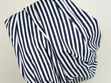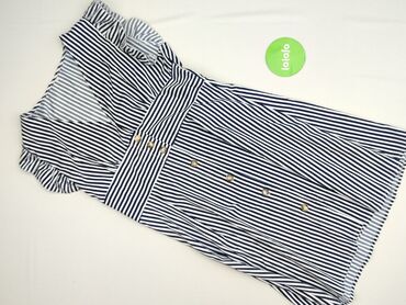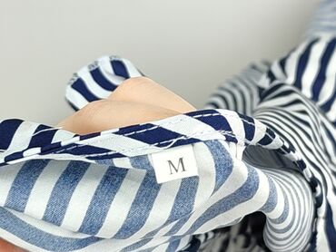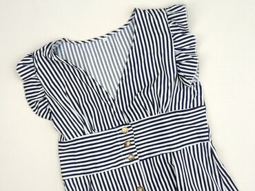 Sukienka w paski – granatowo-białe, drobne pionowe prążki. - Krój: kopertowy dekolt z przodu, zaznaczona talia z elastycznym marszczeniem, rozszerzana spódnica o długości midi. - Rękawy: krótkie...