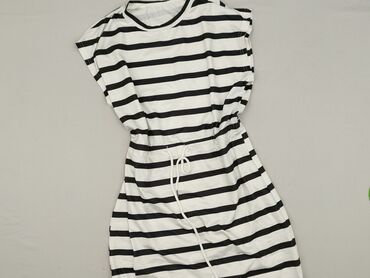 Sukienka damska House Collection, rozmiar L - Fason: dopasowana, długość midi, krótkie rękawy, okrągły dekolt - Wzór: poziome paski w kolorach białym, czarnym i musztardowym - Skład materiału: 97%...