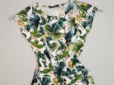 Sukienka damska HOUSE BRAND, rozmiar S - Fason: rozkloszowana mini z odcięciem i delikatnym marszczeniem w talii - Dekolt: w kształcie litery V - Rękawy: krótkie, lekko rozkloszowane - Wzór: tropi...