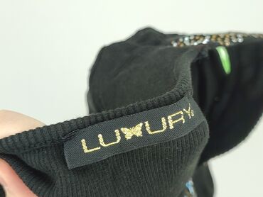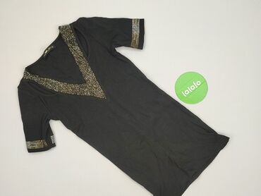 Na co dzieńCzarna, dopasowana sukienka/tunika z krótkim rękawem marki LUXURY. Elastyczna, prążkowana dzianina ładnie układa się na sylwetce. Głęboki dekolt w kształcie litery V zdobiony rzędem drobnych, połyskujących dżetów w kolorach złota i srebra; takie same aplikacje znajdują się na mankietach rękawów. Długość mini/za biodra – idealna jako sukienka lub dłuższa bluzka do legginsów. Klasyczna czerń i błyszczące wykończenia nadają stylizacjom wieczorowego charakteru. Marka: LUXURY (metka widoczna na zdjęciu). Kolor: czarny z metalicznymi zdobieniami. Materiał: miękka, elastyczna dzianina prążkowana. Detale: dekolt V, krótkie rękawy, ozdobne dżety na dekolcie i mankietach. Zastosowanie: wyjścia, imprezy, casual chic.
