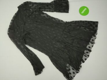 Czarna sukienka mini z długim rękawem i falbanami. - Materiał: lekki, półprzezroczysty szyfon z fakturą – drobne, wypukłe kropki (plumeti), podszewka na dole - Fason: rozkloszowany, odcinana w pas...Stan: