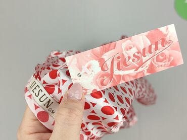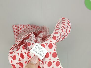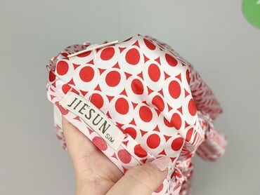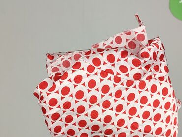 - Wzór: biały materiał w czerwone grochy z drobnymi trójkątnymi akcentami