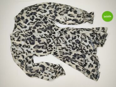 Sukienka damska w czarno‑białe, drobne, „animal” kropki. - Rozmiar z metki: EU 36/38 (US S) - Fason: z dekoltem w serek, długi rękaw, odcięcie/lekko marszczona linia w talii z doszytą falbaną na ...