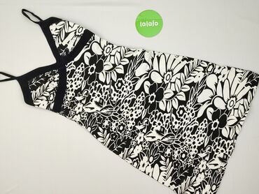 Sukienka damska na ramiączkach, długość midi. - Kolorystyka: czarno‑biały drobny wzór kwiatowy z akcentami kolorowych motyli (fiolet/turkus/róż). - Krój: prosty, lekko dopasowany, odcinana w pasi...