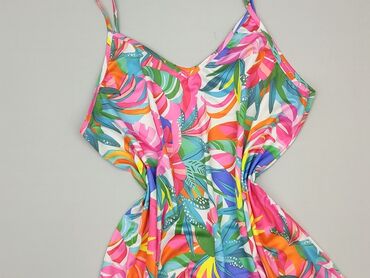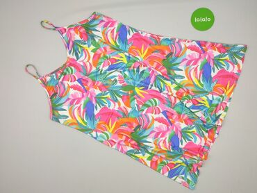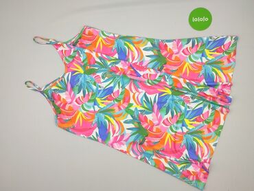 Sukienka damska z tropikalnym nadrukiem - Krój: luźna, prosta, bez rękawów - Dekolt: okrągły z marszczeniem - Ramiączka: szerokie, delikatnie falowane - Dół: asymetryczny z troczkami do ściągnięci...