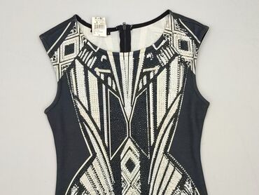 Sukienka damska bez rękawów, czarno‑biała, rozmiar S. - Krój: dopasowana góra z geometrycznymi, kontrastowymi wstawkami w kolorze białym; dół ołówkowy do kolan. - Dekolt: okrągły. - Zapięcie: dług...
