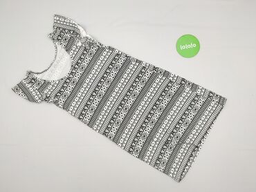 Sukienka damska z krótkim rękawem, rozmiar XL. - Kolor: biały w czarne, graficzne wzory (motywy geometryczne i kwiatowe). - Krój: dopasowany, długość przed kolano; dekolt kopertowy w kształcie V....